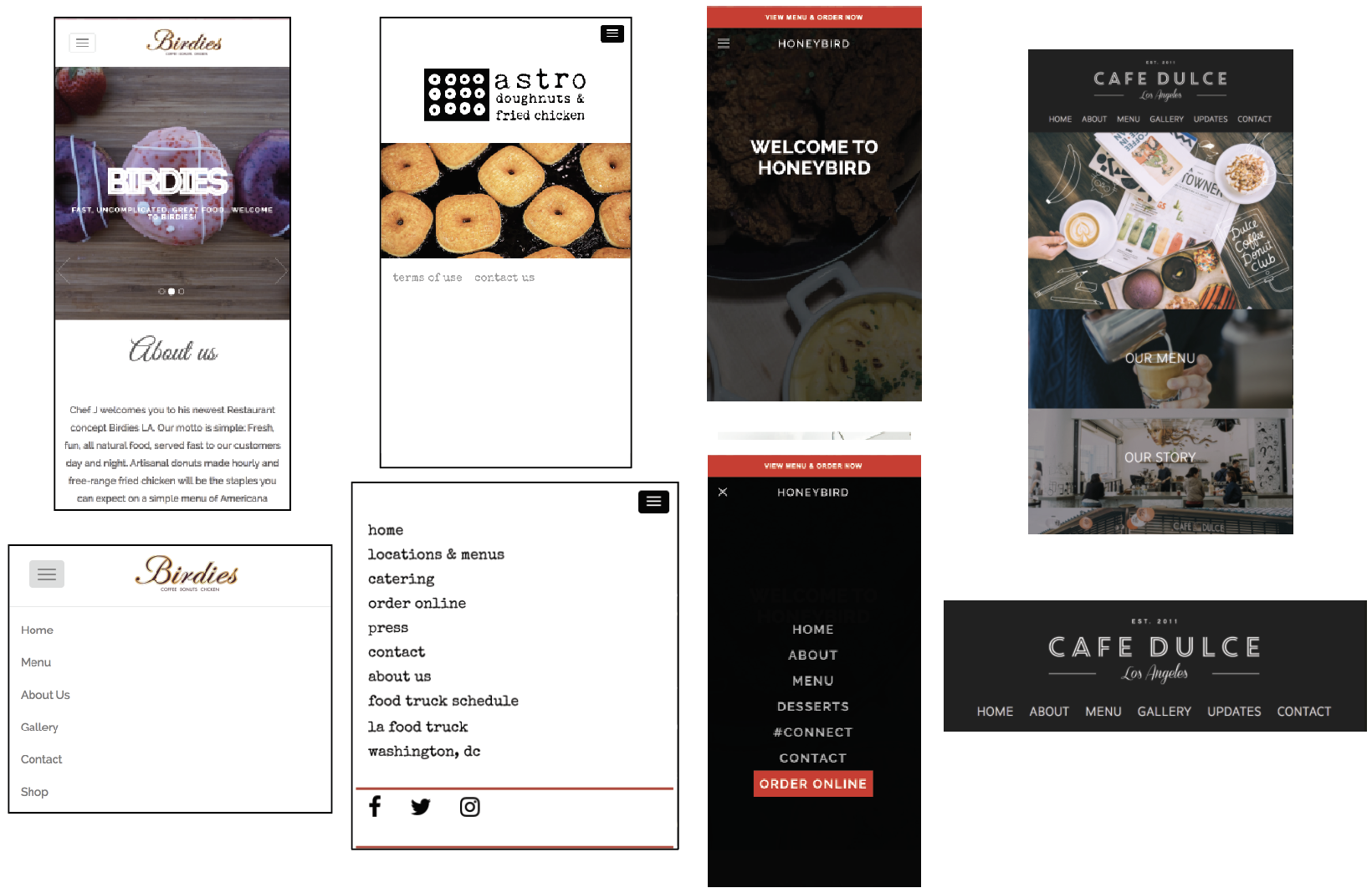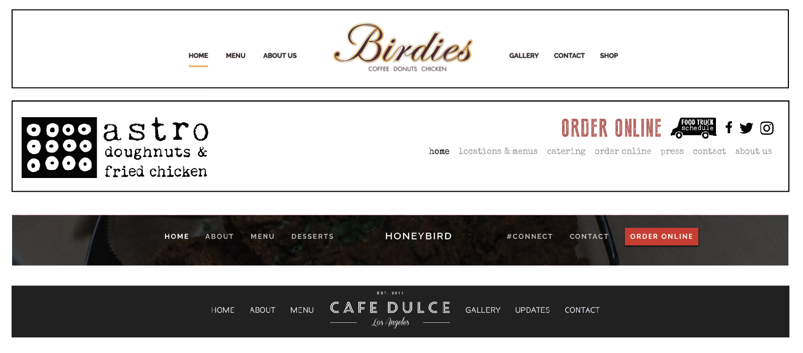 Birdies mobile website looks a bit outdated. I like that it has a hamburger menu but the icon does not look very graphically pleasing. Astors is very simple but its works well since there logo is a graphic element in itself and it corresponds well with the hamburger menu and the type style. Same this with Honeybird. The red bar draws attention well and I like that when you open the menu it fills the whole page. It makes it easy to read all the pages. I really like Cafe Dulce’s navigation bar, the only problem is that the pages are too small and they can be hard to read and press. I think a hamburger menu would have worked well on that website.