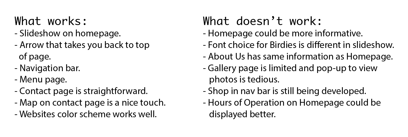 Birdies states that their motto is “Fresh, fun, all natural food, served fast to our customers day and night.” They want to use their website to inform their customers that they can come to Birdies to enjoy great food at their convenience. Although they want an informative website their About Us page is very small. They can add so much more about where they get their produce and about their employees and company.