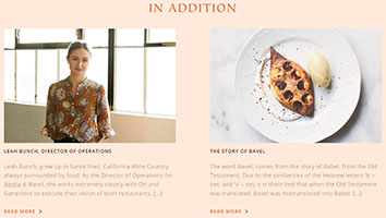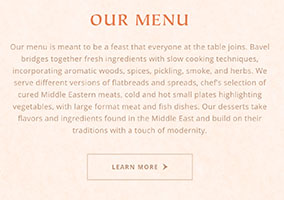 - Unlike Society Kitchen, Bavel keeps the main page simple and clean without making users scroll unnecessarily. And the one item they discuss on the main page (the menu) provides a link To Learn More.