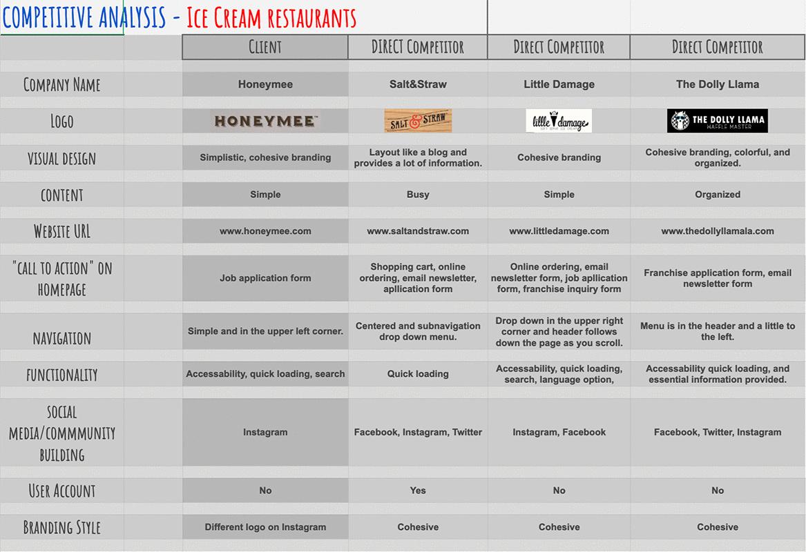 The competitor website had cohesive branding, attractive colors, and an easier flow compared to the other competitors. The information was readable, organized, easy to navigate, memorable, and friendly. Honeymee has the potential to provide all of which The Dolly Llama does for a user, while being simple, organized, and cohesive branding.