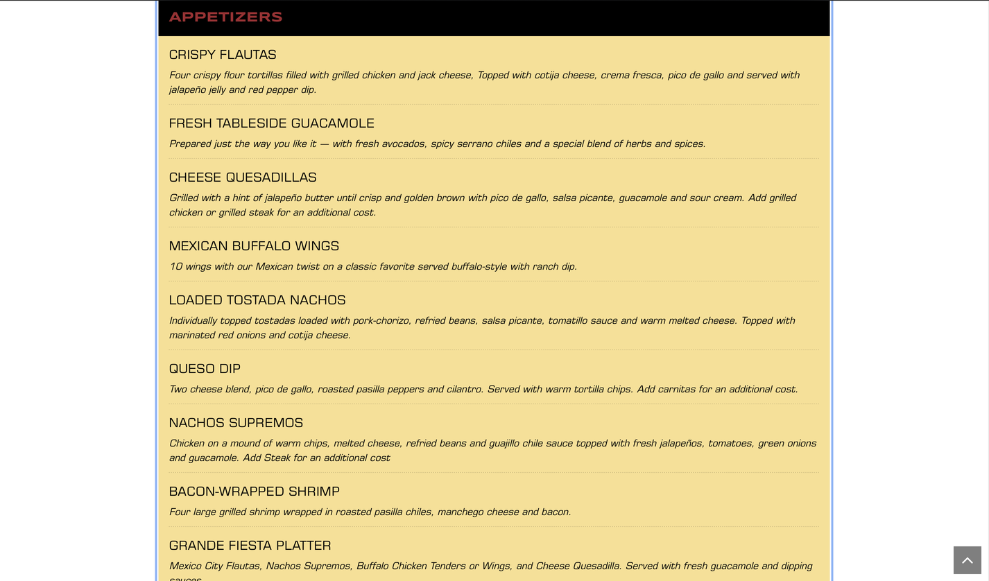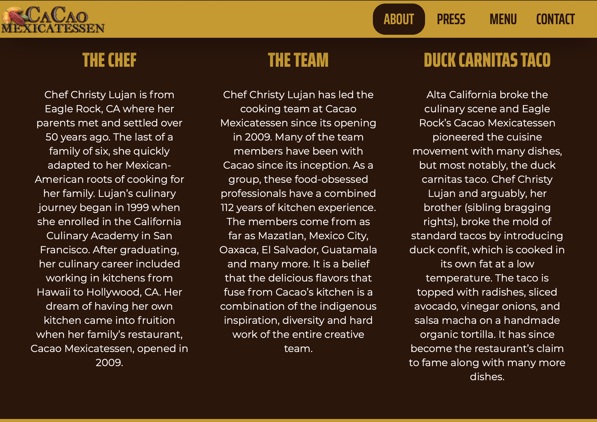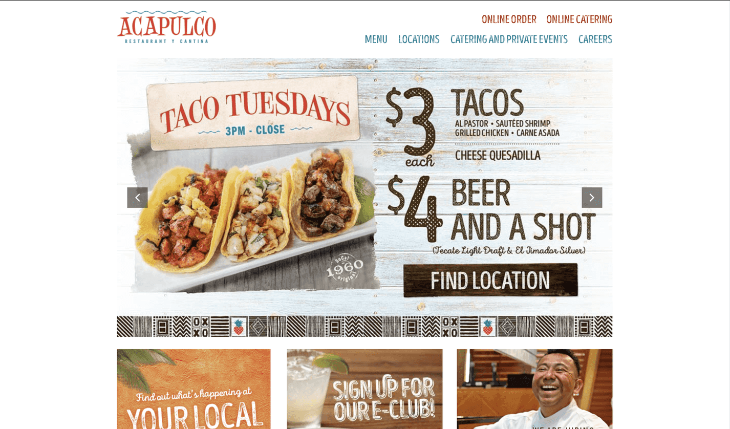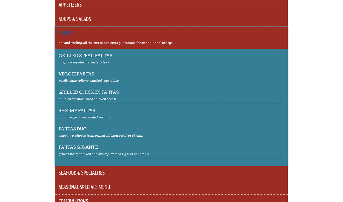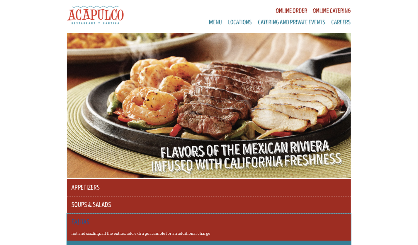 The styles and patterns have a very exotic feel especially with palettes of light colors that identify with the sea, since one of their specialties is seafood . The hierarchies are different, the headers are in capitals and in serif and the subheaders are lowercase and in script, which gives it a smooth feel. The look and feel of the site seem to fit the brand, especially since it's a Mexican restaurant, since the culture and food of Mexico is colorful. The visuals are fresh, simple, and consistent. The visual design supports usability that anyone can use the site.